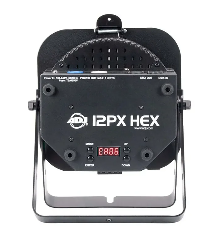 12PX HEX professional features include: locking power In/Out connections to daisy chain power, 4 DMX modes (6, 7, 8, & 12 channel), 5 operational modes, 5 dimming curves, flicker free operation and a 4-Button DMX menu with digital display. Users may choice 3-pin or 5-pin DMX connectors.