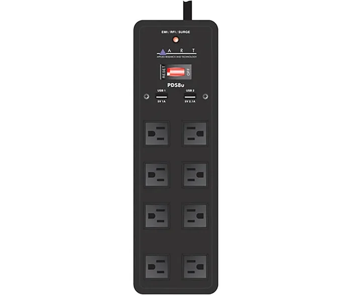 The Art PDS8u, is an 8 Outlet Surge Protector Built for maximum functionality, the PDS8u has Eight AC outlets with opposing orientations ensuring easy access for AC cables. Two AC outlets are spaced for large size ‘wall wart’ adaptors. 1.0 and 2.0 Amp USB ports are included for powering tablets, iPhones, and other USB accessories for added convenience.
