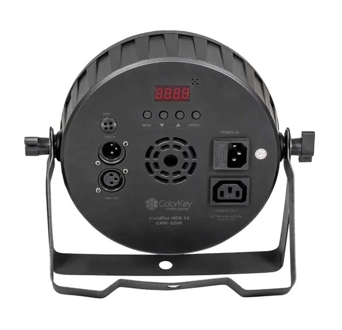 The Color Key CKU-2260 Color key Vivid par Hex 12 is an intensely bright and vivid hex-colored RGBAW+UV LED wash light. It’s an excellent choice when you’re in the need for a rich color wash, temperate white wash, or UV FX splash. It will easily illuminate your events with richly saturated colors, a variety of whites, and a brilliant ultra-violet, while offering simple push button control with the included IR remote.