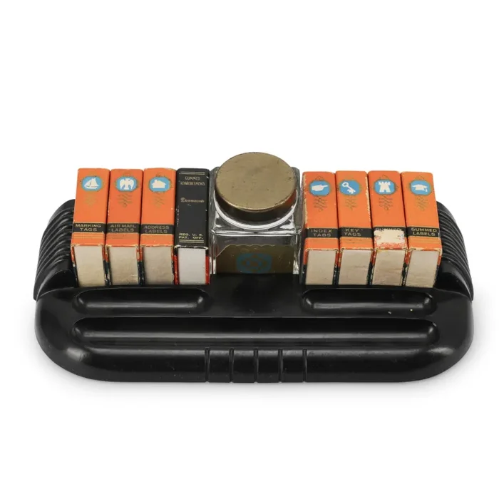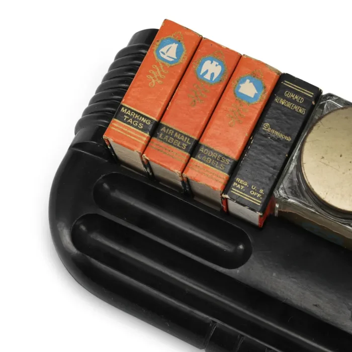 Details: Vintage desk tray with various cubbies for ink and labels.