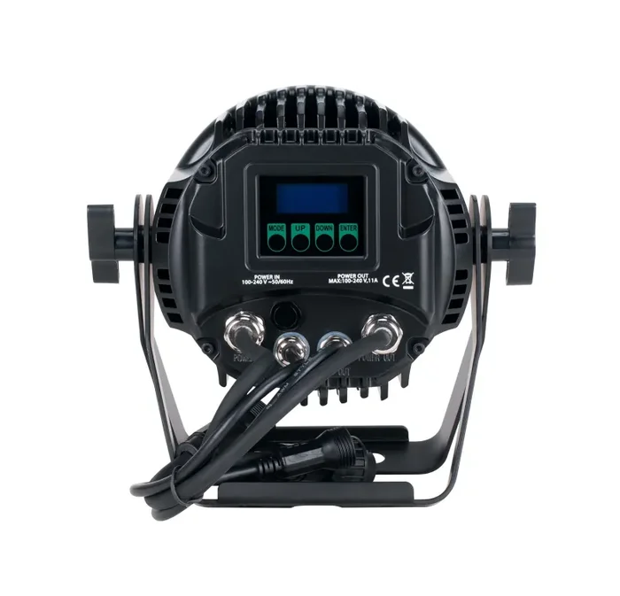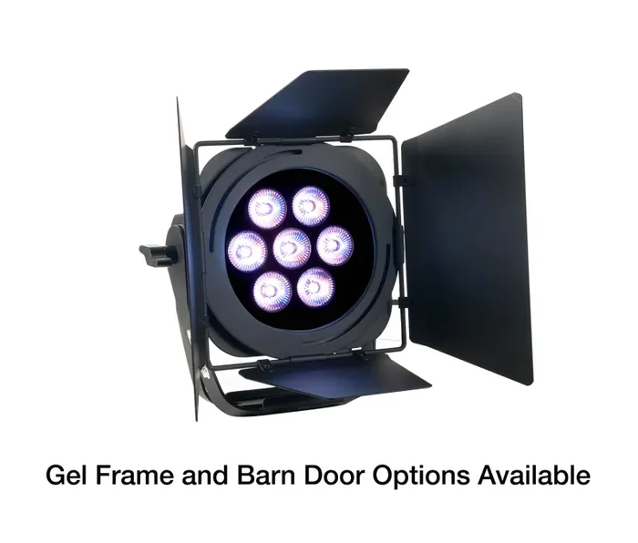 The Elation SIXPAR 100IP, Features (7) 12W 6-IN-1 RGBAW+UV LEDs, 15° beam and 25° field angles, electronic strobe and dimming (0-100%), 5 variable dimming curve modes, dual yoke / floor stand, multiple unit power linking, RDM (remote device management), rugged die-cast aluminum exterior, flicker free operation for TV and FILM, and a multi-voltage universal auto switching power supply (110-250v).