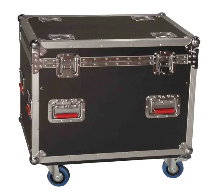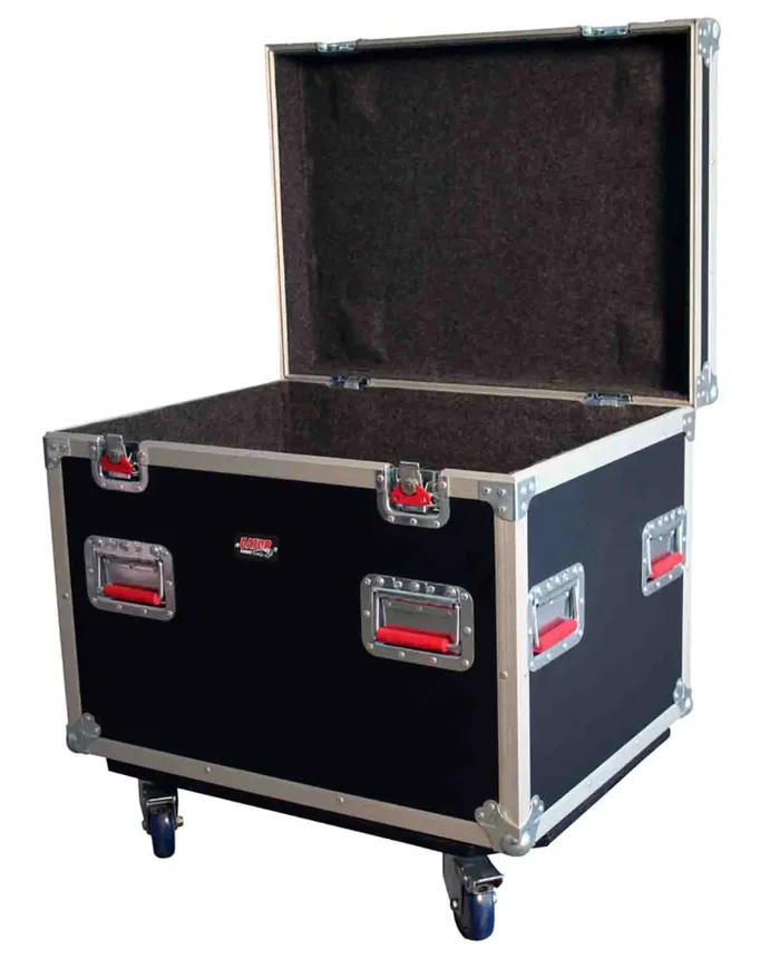 The Gator Case G-TOURTRK3022HS is 9mm Plywood Construction with Laminated Exterior. Red Recessed Twist Latches. Heavy-Duty Commercial Grade Plated Hardware and Reinforced Ball Corners. Truck Pack Trunk with Hinged Lid and Grey Carpet Interior. Recessed Dishes on Top of Case Allow Stackability. 4 Casters, 2 Locking.