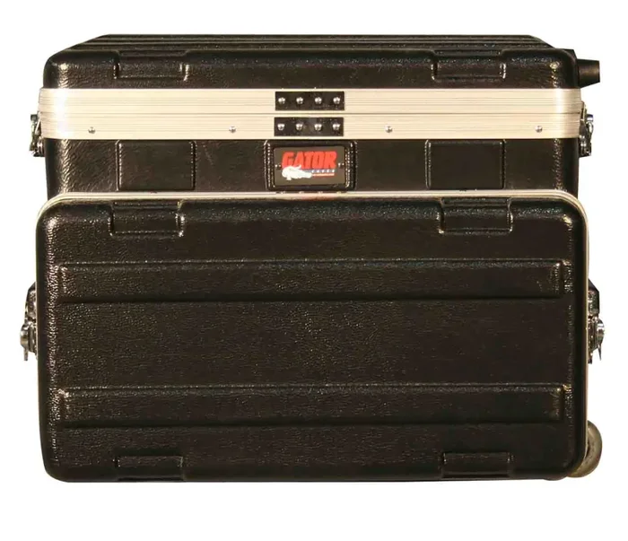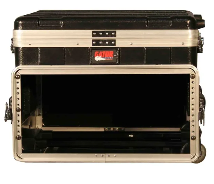 The Gator Case GRC-STUDIO4GO-W is Rugged ATA-Style Polyethylene Construction. Available with 2U or 4U of Rack Rail for Rack Mount Recording Devices and Disk Drive. Adjustable Laptop Compartment with No-Slip Web Strap Tie-Downs. Convoluted foam interior in lid. Access hole between top and bottom compartments allow the laptop to be permanently connected to the recording gear. Retractable handle and wheels.