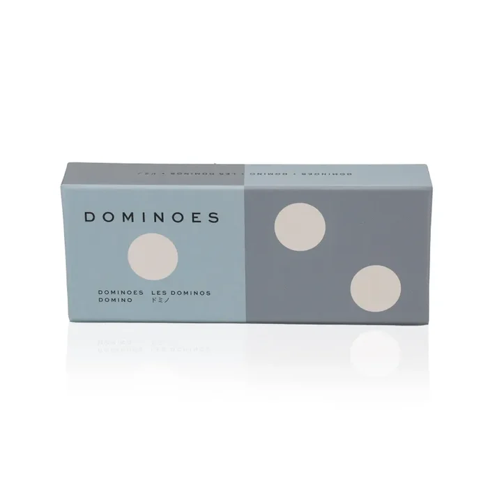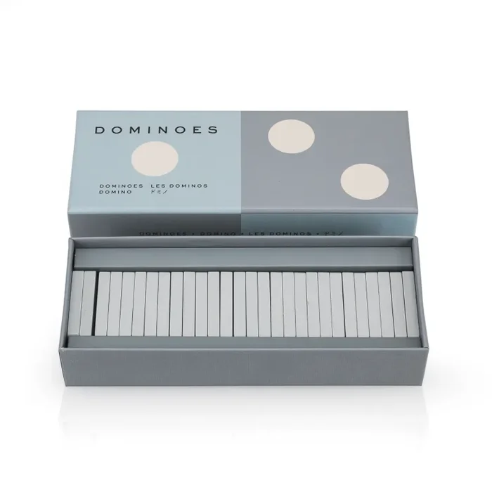 Details: Dominoes game set with grey game pieces and blue / grey box.