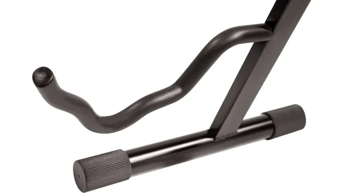 This sturdy A-frame guitar stand features heavy-duty tubing, rubber padding, and a “uni-construction” design, which means that there are no parts to lose. The A-Frame Guitar Stand holds both acoustic and electric guitars thanks to the unique design of the support arms; and it folds up nicely for storage and simple transport.
