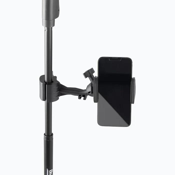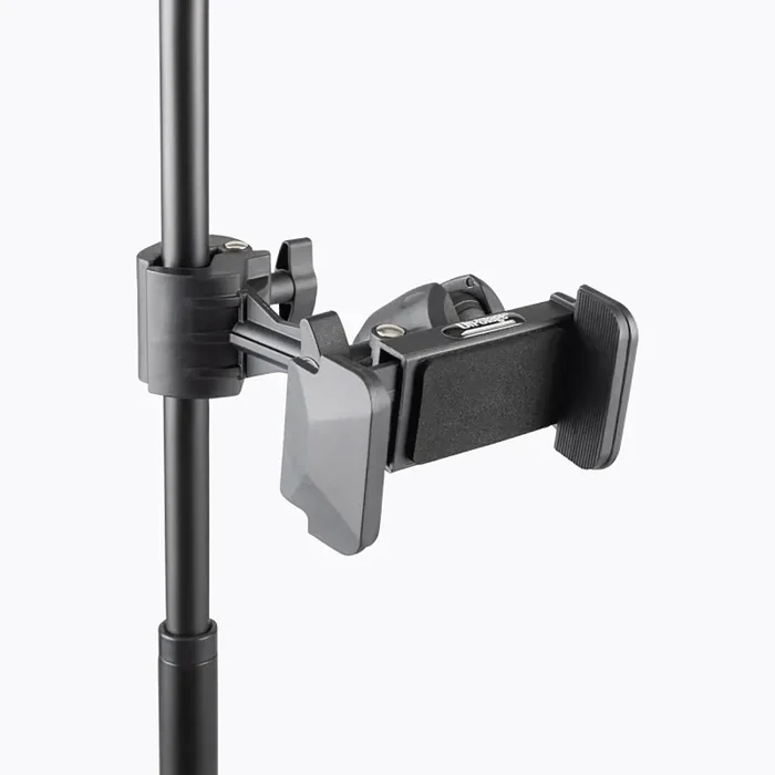 The On Stage TCM500, Smartphone Holder for Mic Stands securely attaches to a mic stand and holds a smartphone for ease of reading music or lyrics, live streaming, or creating audio/visual content. This space-saving holder makes it possible to mount a phone in a convenient location for practice, performance, streaming, or recording without setting up an extra stand. The ball joint on the phone clamp provides the option to mount the phone for use in portrait or landscape modes. It also enables rotation and tilting of the phone to further dial in just the right angle for comfortable viewing or for streaming or recording video. The phone clamp adjusts in size to ensure a snug fit for a wide range of phones up to 4 inches in width. Padding on the clamp protects phones from scratches and dents while providing traction for a secure, stable grip to keep phones safely in place. With its black finish, this versatile accessory adds to a professional presentation in any venue, recording studio, or streaming setup.