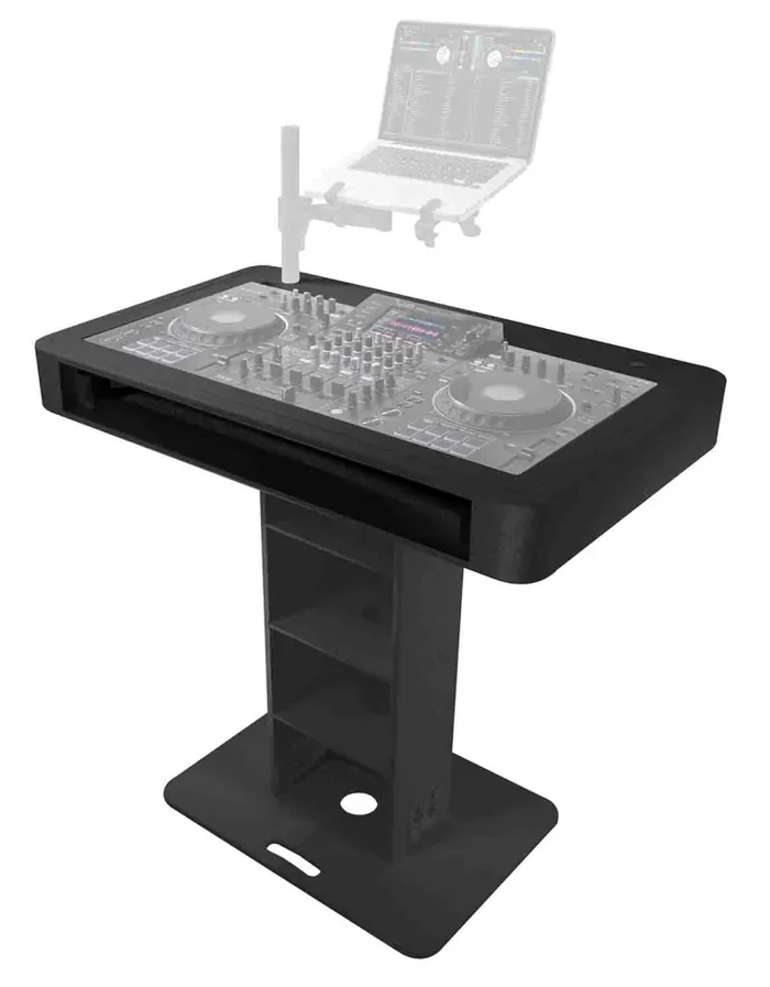 The T-shaped DJ Controller podium is manufactured in Poland made from the highest quality materials in Europe. Top-quality birch plywood finished with black warnex textured paint. The inside of the control deck is lined with high-density foam that stabilizes and secures your controller firmly into the control deck. Place your laptop on the secure tray attached to the included boom arm that can tilt, swivel, rotate, raise, and lower to your desired position. The podium center is equipped with three-tier shelves (for utility storage, mics, cables, etc). There are pre-drilled holes in each shelf to allow power and audio cables to pass through from the controller down to the base area.
