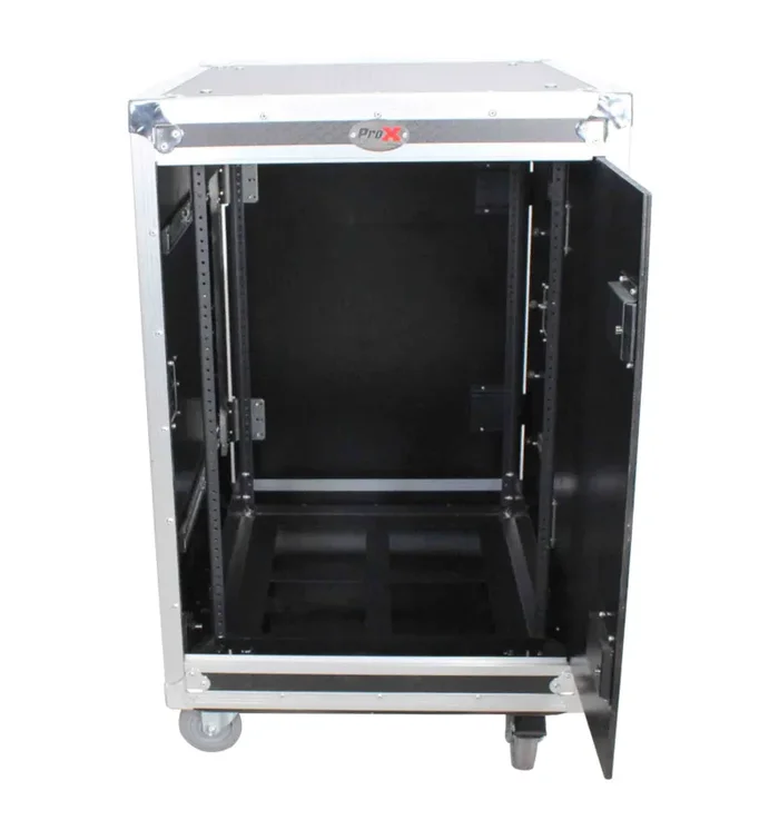 The ProX T-12USLAM20, 12U 20″ Deep Vertical Rack Shock Mount Case with 2 Sliding Slam Doors and 4″ Caster Wheels. This versatile case combines functionality with convenience, featuring 2 sliding doors for easy access and caster wheels for effortless mobility.