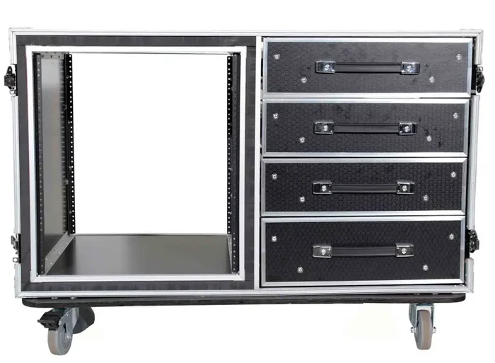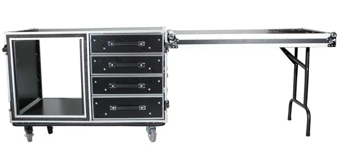 This case features four, easy to open drawers and two side work tables to keep your gear organized and easily accessible for your professional events. The other side has a 12 Unit Rack Space that can be loaded from either side depending on your needs.