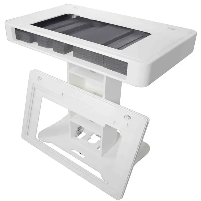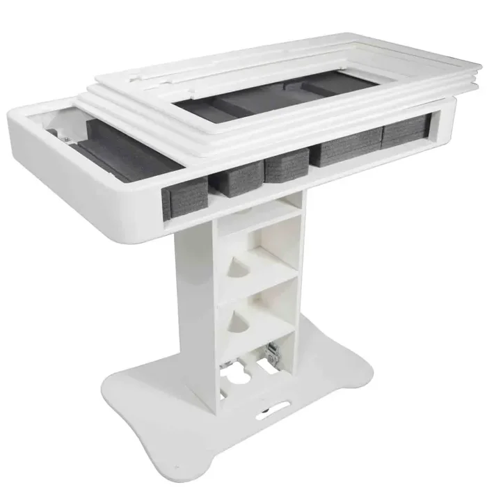 The T-shaped DJ Controller podium is manufactured in Poland made from the highest quality materials in Europe. Top-quality birch plywood finished with white warnex textured paint. The inside of the control deck is lined with high-density foam that stabilizes and secures your controller firmly into the control deck. Place your laptop on the secure tray attached to the included boom arm that can tilt, swivel, rotate, raise, and lower to your desired position. The podium center is equipped with three-tier shelves (for utility storage, mics, cables, etc). There are pre-drilled holes in each shelf to allow power and audio cables to pass through from the controller down to the base area.