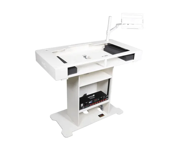 The T-shaped DJ Controller podium is manufactured in Poland and made from the highest quality materials in Europe. Top-quality birch plywood finished with white Warnex textured paint. The inside of the control deck is lined with high-density foam that stabilizes and secures your controller firmly into the control deck. Place your laptop on the secure tray attached to the included boom arm that can tilt, swivel, rotate, raise, and lower to your desired position. The podium center is equipped with two-tier shelves (for utility storage, mics, cables, etc.). There are pre-drilled holes in each shelf to allow power and audio cables to pass through from the controller down to the base area, and an 8U rack space.