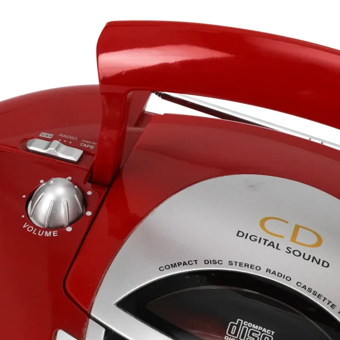 Details: Glossy red boombox with silver details.
