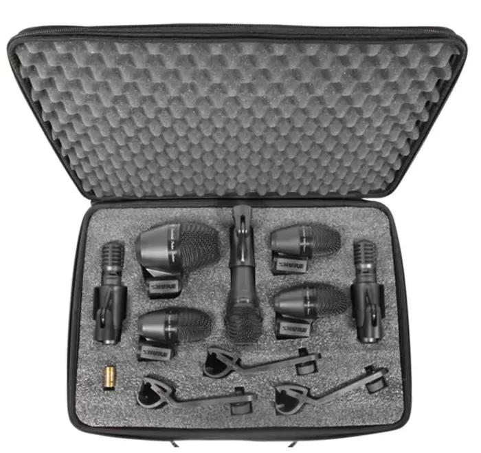 The Shure PGADRUMKIT7, is a 7PC Drum Microphone Kit includes a complete microphone package for reinforcing kick drums, snare drums, rack toms, floor toms, congas and cymbals for performance and recording and complete package of professional quality microphones designed to provide excellent sound for full drum kit performance and recording.