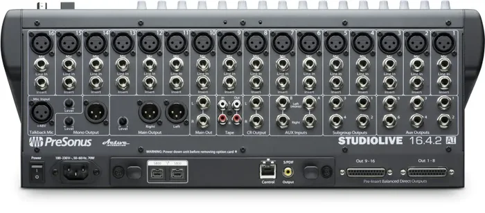 Take a look at back panel of a StudioLive AI-series mixer, and you’ll find the robust analog connections you’d expect from an expensive analog mixer: separate balanced mic and line inputs and insert points on every channel; dedicated balanced outputs for every aux bus, subgroup, and the mains; and a wealth of other dedicated inputs and outputs. Every input channel and bus send has its own dedicated jack—no sharing, no compromises—so you always know what’s flowing from each output.