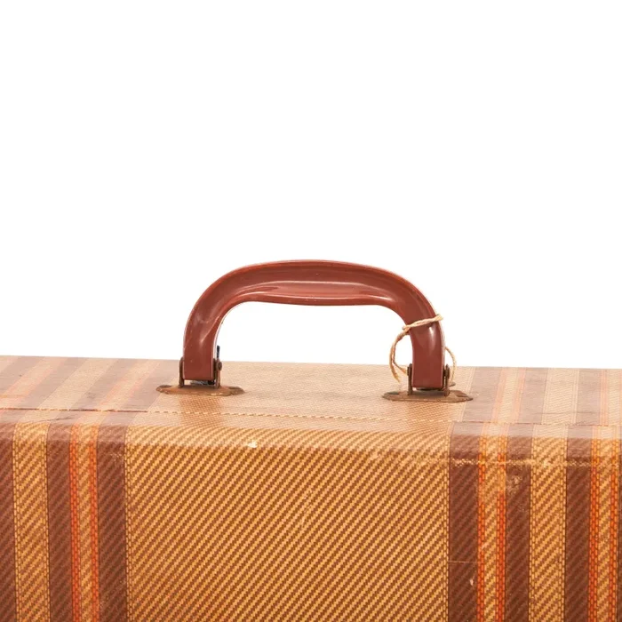 Tan Hardshell Suitcase with Brown-Red Stripes