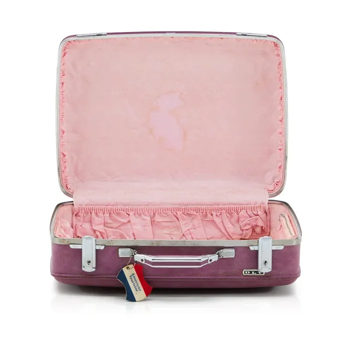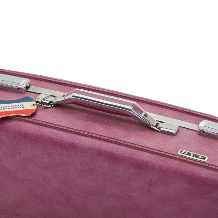 Details: Vintage American Tourister small purple vinyl suitcase with pink interior