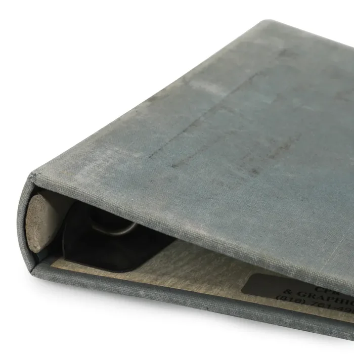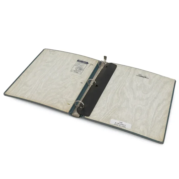 Details: Distressed binder with faux wood pattern inside.