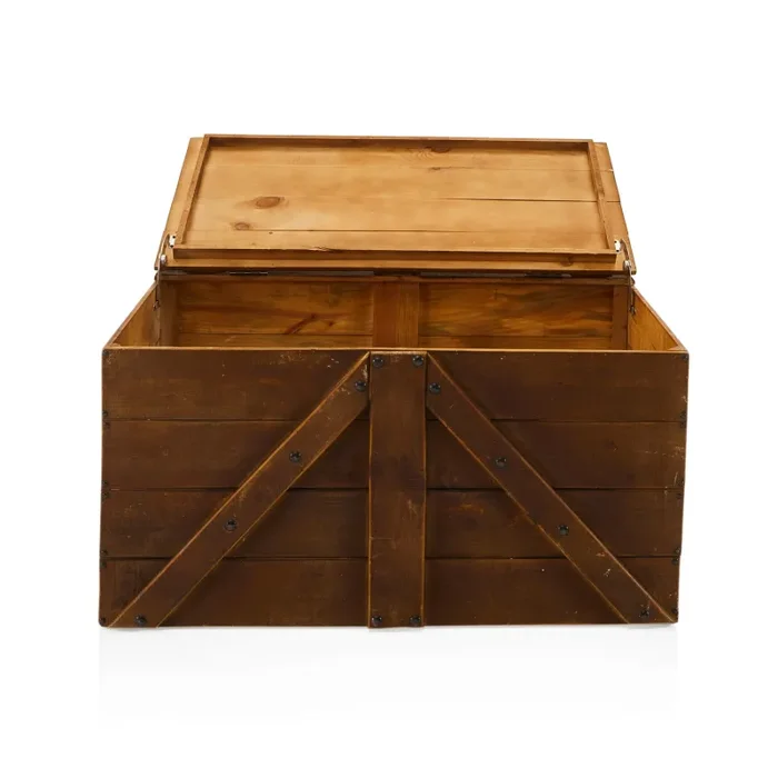Details: Plain wooden trunk with diagonal braces and black metal hardware